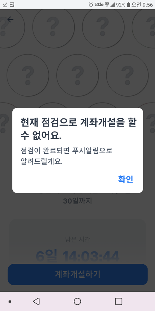 - "현재 점검으로 계좌개설을 할 수 없어요"라는 문구부터, "연계기관의 점검으로 서비스 이용이 불가능합니다"라는 문구까지, 여하튼 더이상의 절차 진행이 안되었습니다. [본문으로]