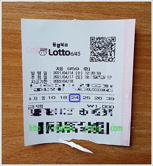 - '로또 959회'의 1등 당첨번호는 '1 & 14 & 15 & 24 & 40 & 41'이고, 2등보너스 번호는 '35'였는데요. 제가 구입한 '로또 959회'에는 이 회차 로또번호 중 '24'번 딱 하나만 들어있어서 결과적으로 '꽝'이 되고 말았습니다. [본문으로]