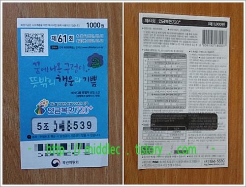 - 아래 이미지 속 '61회 연금복권'~. 아무쪼록, 다음 주에 추첨하게 될 '연금복권 61회 당첨번호'와 제대로 좀 맞아떨어졌으면 좋겠습니다. ^^ [본문으로]