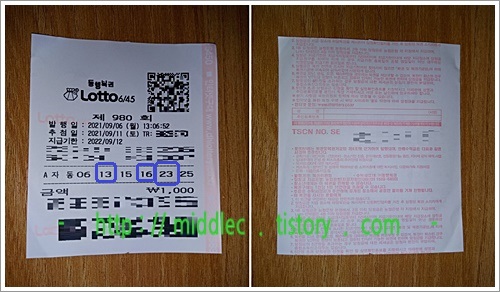 자동 방식으로 구입한 '로또 980회' 복권, 천원짜리가 5등에 당첨이 되었습니다. ^^1