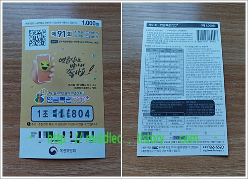 - 아래 이미지 속 '91회 연금복권'~~~. 아무쪼록, 다음 주에 추첨될 '연금복권 91회 당첨번호'와 좀 맞아떨어지면 좋겠네요. ^^ [본문으로]