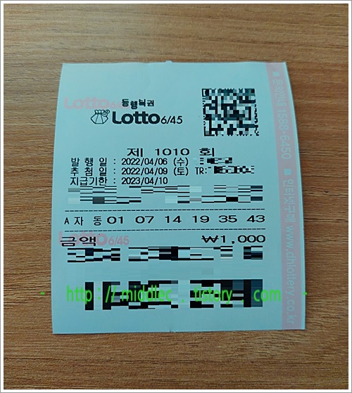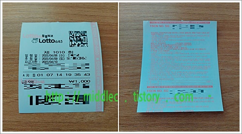 결과를 맞춰봤더니, '오늘 제 복권과 같이 꽝, 혹은, 당첨이기는 하지만 바람에 못미친다 하는 경우'에는, 하는 수 없이 내주의 추첨 회차인 '로또 1011회'를 미리 사뒀다가 추첨될 '로또 1011회 당첨번호'와 일치하기를 기대해보아야겠습니다. ^^