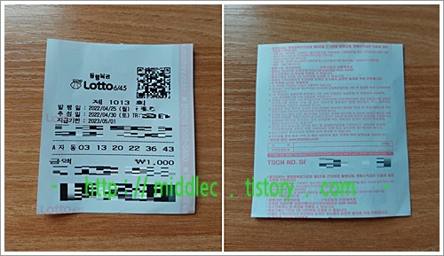제가 산 '로또 1013회 자동' 복권의 결과는 '번호 두 개가 일치하는, 꽝'이었습니다. ㅠㅠ