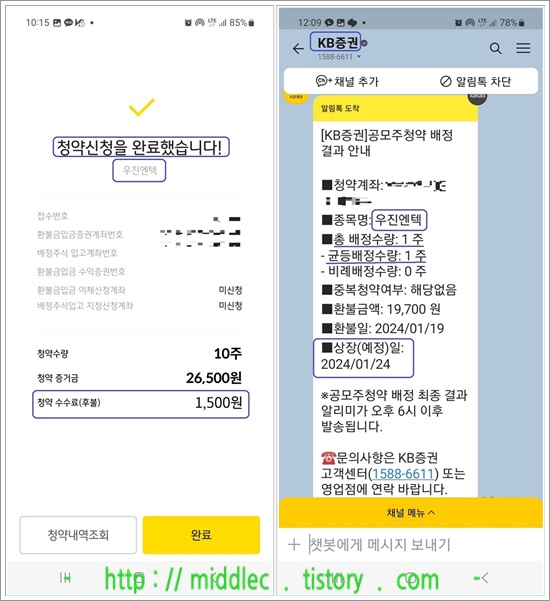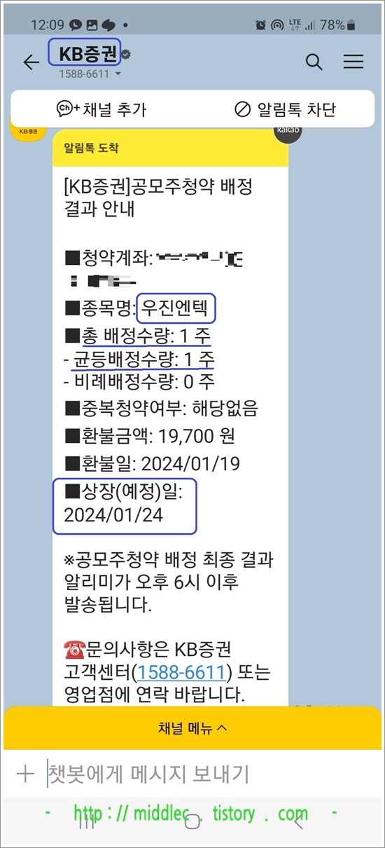 이후에 KB증권이 보낸 '공모주청약 최종 배정 결과 안내' 카톡을 확인하니 '우진엔텍 상장일'이 '1월 24일'로 나와있었습니다.